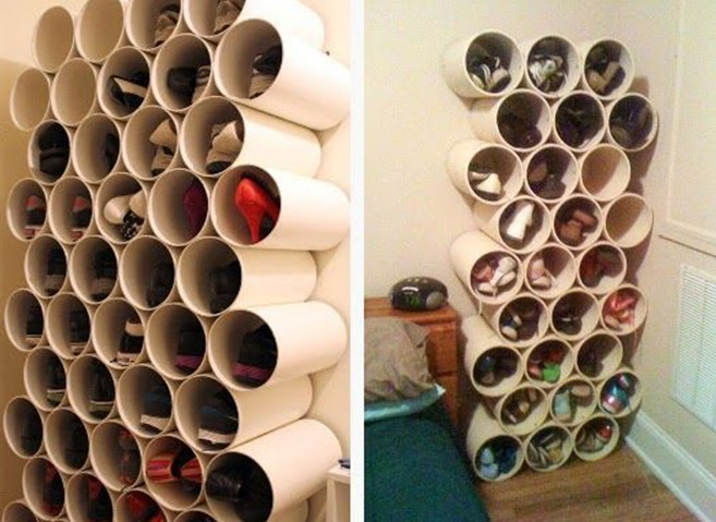 Tempat sepatu. Anda bisa menggunakan pipa PVC C4” atau C5” dengan ketebalan yang tipis sehingga anda mudah untuk memotongnya. Potong beberapa pipa dengan panjang sesuai ukuran sepatu anda susun dan tempel. rak sepatu pun siap anda gunakan.